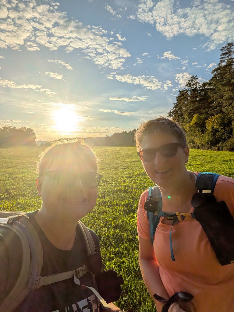 Wir gingen Etappe 1 trotzdem gut gelaunt und auf Etappe 2 an der Versorgungssation in Illschwang stießen Volker und Buddy zu uns um uns nach Sulzbach wieder zurück zu begleiten. Wir hörten, dass einige Teilnehmende aufgrund der Hitze aufhören mussten und hofften, dass uns das nicht zum Verhängnis wird. Zurück in Sulzbach wartete Andy auf uns, der uns auf Etappe drei und weiter durch die Nacht begleiten wollte. In der Station angekommen machten wir wieder Pause und stärkten uns.