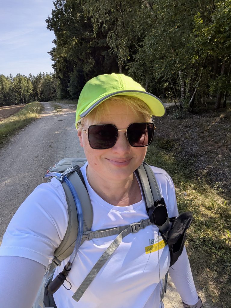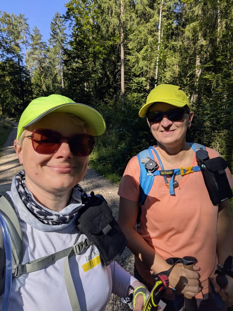Zwiebellook und die Kleidung. Daran haben wir nichts verändert. Armlinge, Beinlinge sind perfekt, auch wenn sich die Temperaturen leicht ändern. Sie bieten Schutz bei Sonne oder leichtem Regen. Gamaschen: ein Must Have, so fliegen keine kleine Steinchen in die Schuhe. Stöcke: kein Marsch ohne unsere Stöcke – sie entlasten den Körper und geben Kraft. Füße pflegen mit Hirschtalgcreme – regelmäßig. Täglich. Nicht erst beim Marsch. Jede von uns hat ihre Lieblingsschuhe. Wir tragen beide Traillaufschuhe (am liebsten die ohne GTX). Jede von uns eine andere Marke. Cap und die selbst tönende Brille sowieso. Und ganz wichtig inzwischen: Reeloq, die Handyhalterung (Werbung aus Begeisterung).