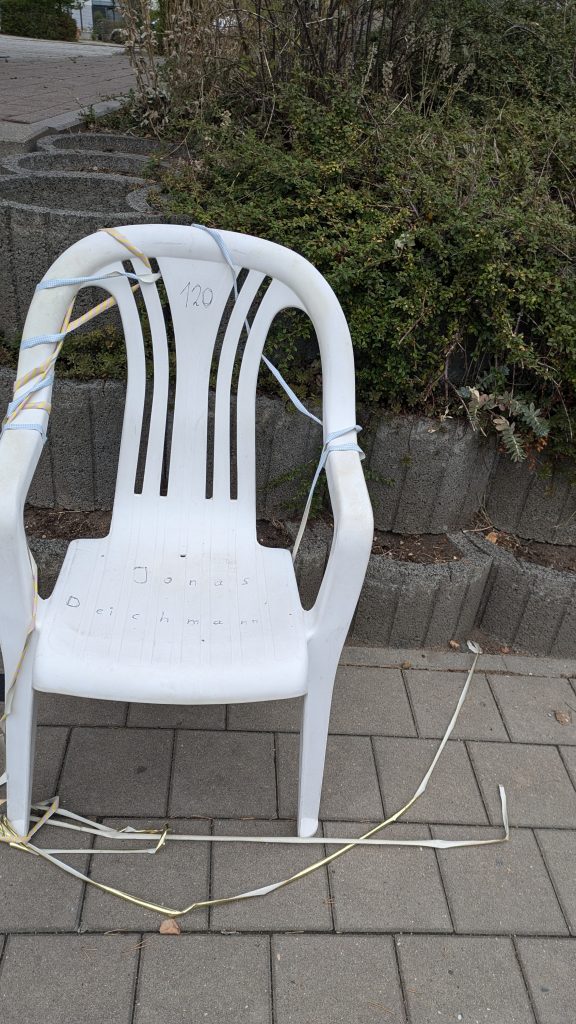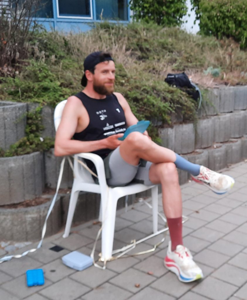 Bei Kilometer 30 legt er einen kleinen Zwischenstopp ein (oft hat er Wassermelone gegessen) und sitzt dabei auf diesem weißen Plastikstuhl:
