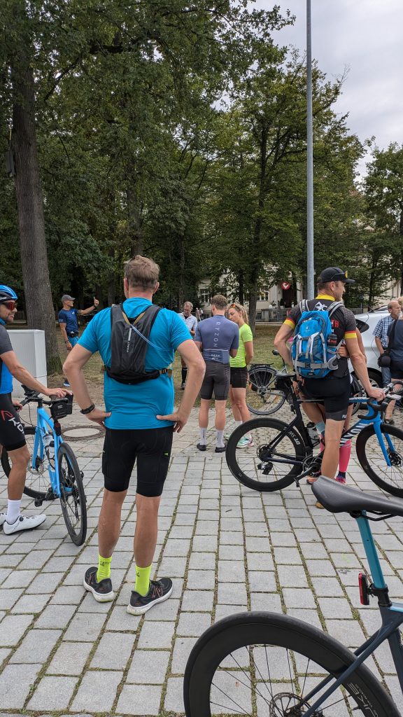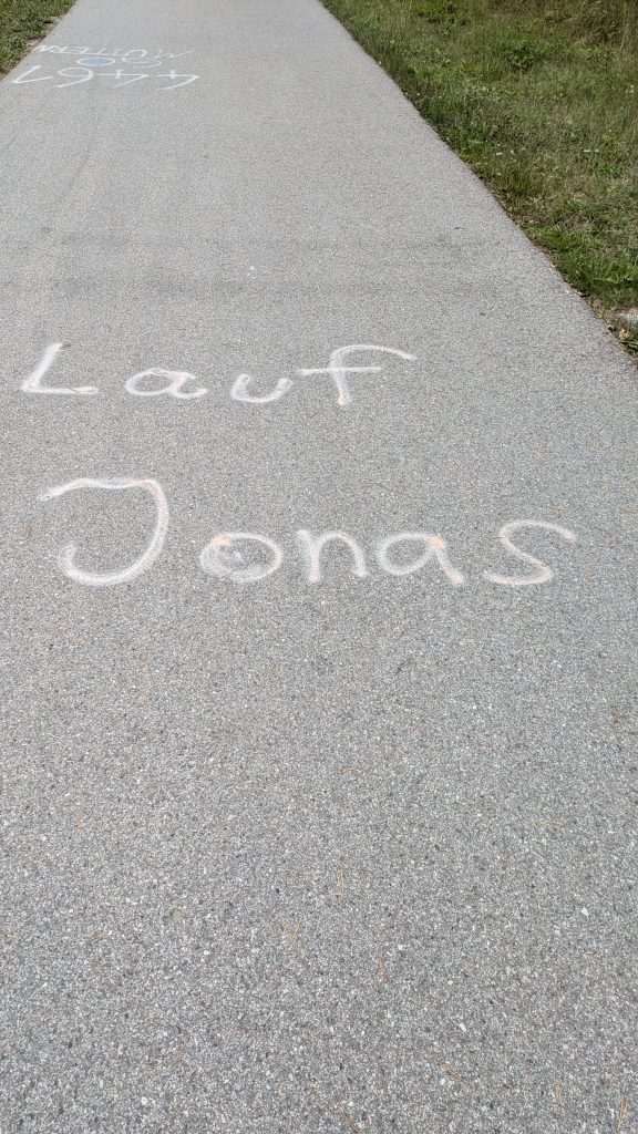Ich muss gestehen: Das Festgelände und der „Torbogen“, durch den er ins Ziel läuft, waren kleiner als ich es mir vorgestellt hatte. Doch die Atmosphäre war überwältigend! Kurz nachdem er vom Rad gestiegen ist, hat sich Jonas im Van umgezogen, eine kurze Pause eingelegt und etwas gegessen. Nach einer herzlichen Begrüßung wurden die „Langdistanzler“ und Maratonis gezählt – und zack! Da startete das „Läufchen“, wie er den Marathon liebevoll bezeichnet.