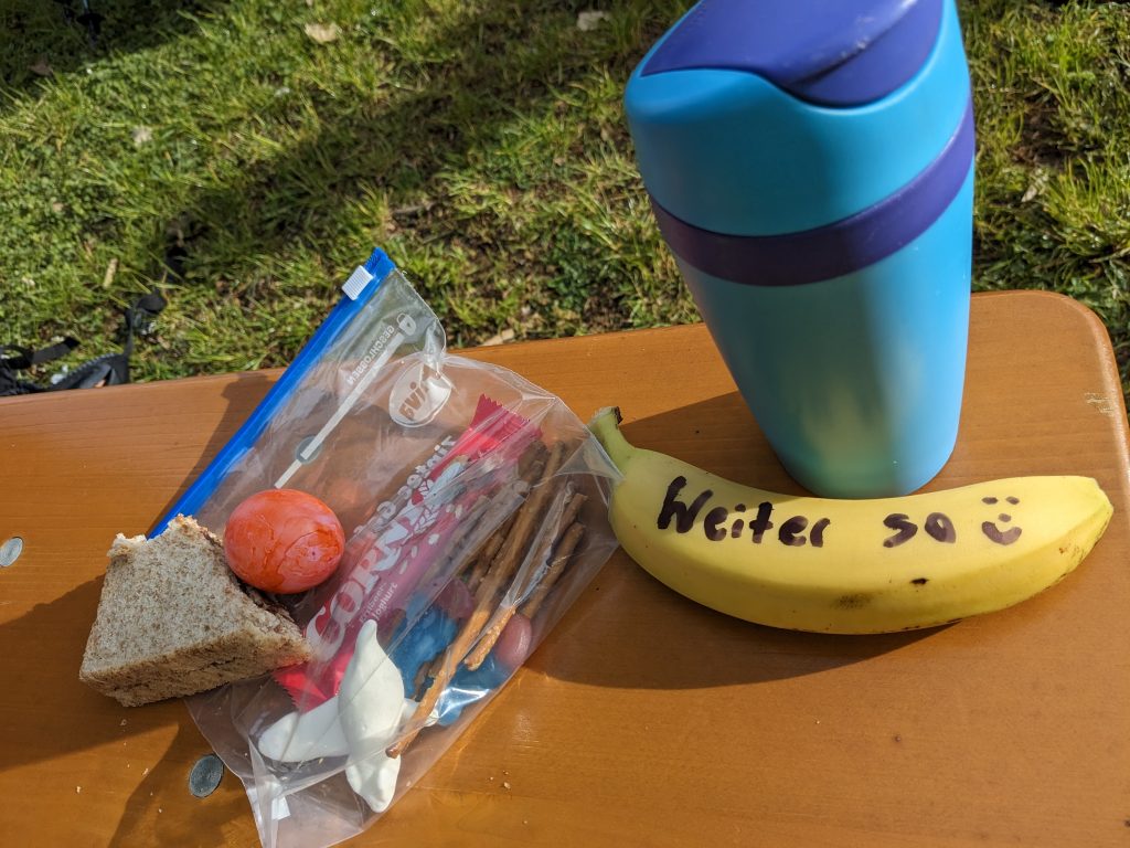 Start war auf der Wöhrder Wiese. Ich würde behaupten die Strecke führte fast 40 KM durchs Nürnberger Umland. Die erste Verpflegungstation (kurz VP) wartete bereits nach 7 KM. Dort packten wir in einen Zipperbeutel eine Banane, Ein gekochtes Ei, Salzstangen und Gummibärchen und aßen ungetostetes Nutellatoasbrot.