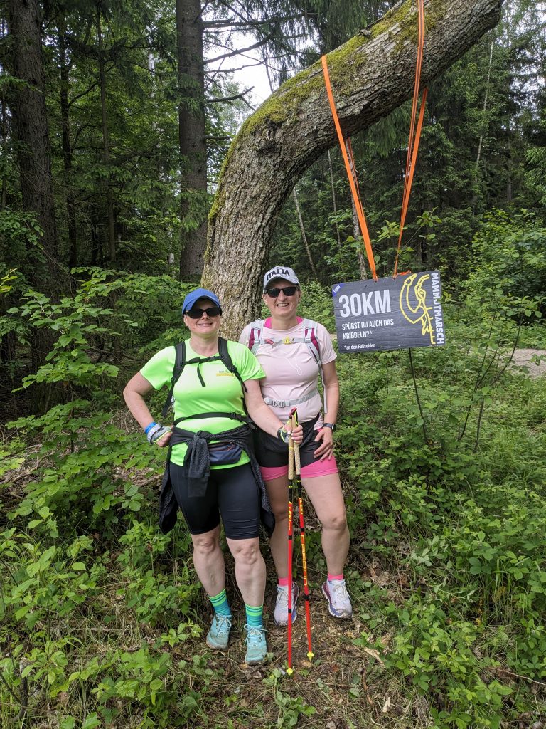 Auch unsere Stöcke haben wir in etwa zu diesem Zeitpunkt rausgeholt und waren beide absolut froh darüber. Die Stöcke entlasten den Körper und geben auch Halt auf den teils schmalen Wegen. Insgesamt durften wir auf dem „flachen Kurs“ 500 HM rauf und wieder runter steigen. Im Vergleich dazu war die Verpflegung beim Megamarsch Nürnberg im November deutlich besser und die Strecke mit knapp 300 HM insgesamt wirklich flach.