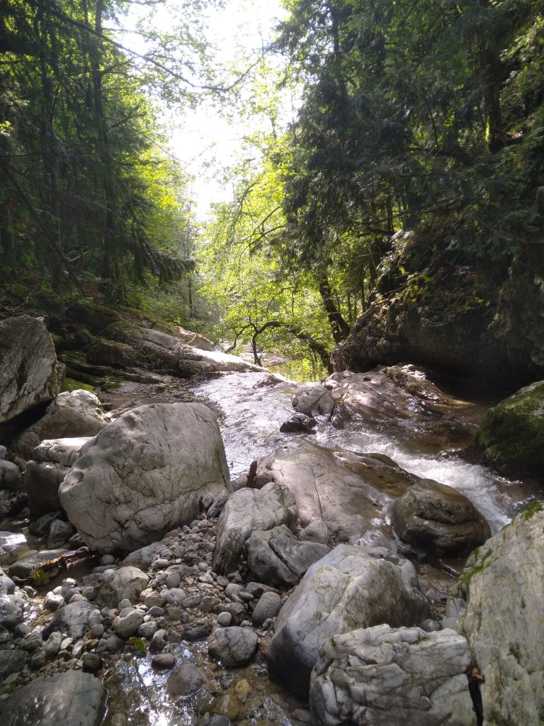 Zwischendurch rutschten wir kleine Strecken wieder hinunter und genossen die Abkühlung im Wasser. Das Wetter war perfekt. Warm, aber nicht zu heiß. Das Wasser erfrischend, aber nicht eiskalt. Herrlich!